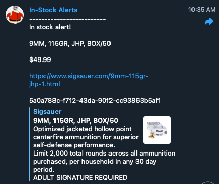 Ammo Scout's Telegram bot enables you to register an account and manage products you would like to watch (or unwatch). The bot will notify you both via Telegram and via email when a products availability changes (e.g. in stock or out of stock).